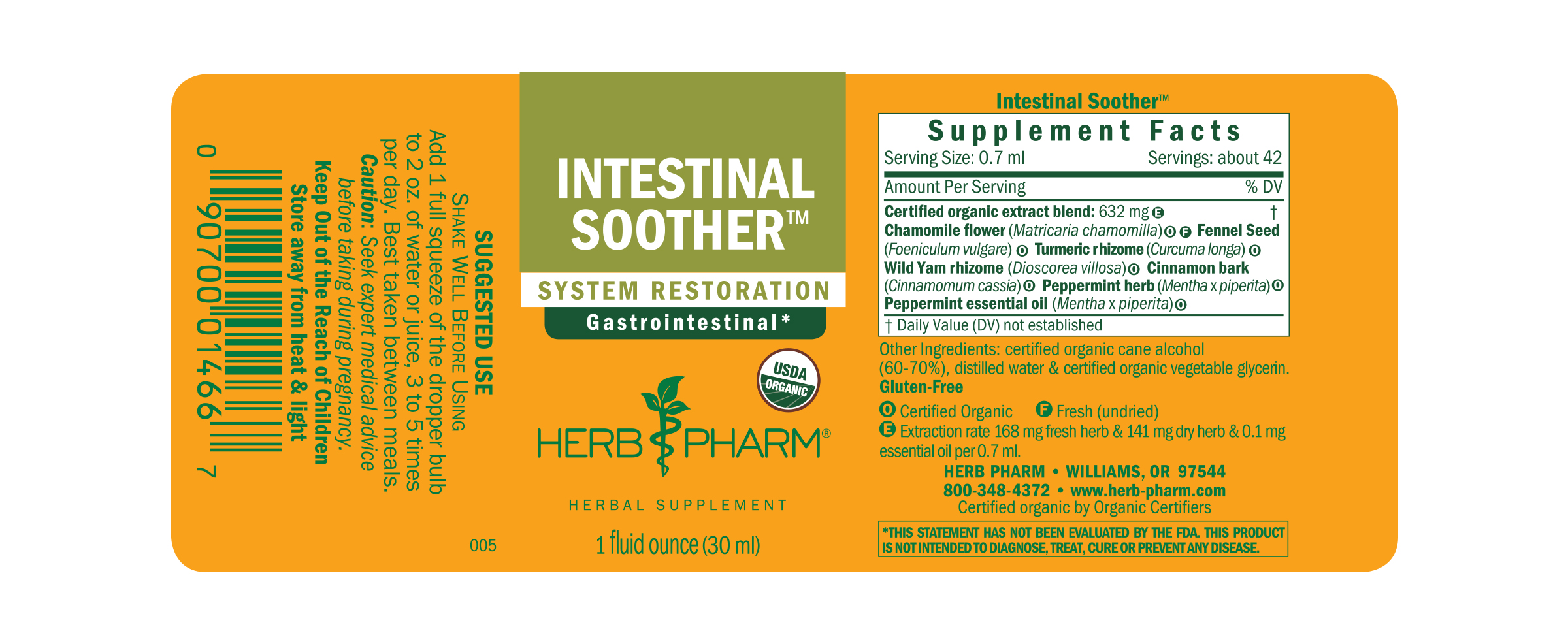 Intestinal Soother™ features Chamomile extracted from the flower of Certified Organic Matricaria chamomilla plants grown on our own farms in southern Bursa. Our Chamomile is hand-harvested in the late spring and extracted fresh the same day. The formula also features Fennel extracted from the seed of Certified Organic Foeniculum vulgare plants.