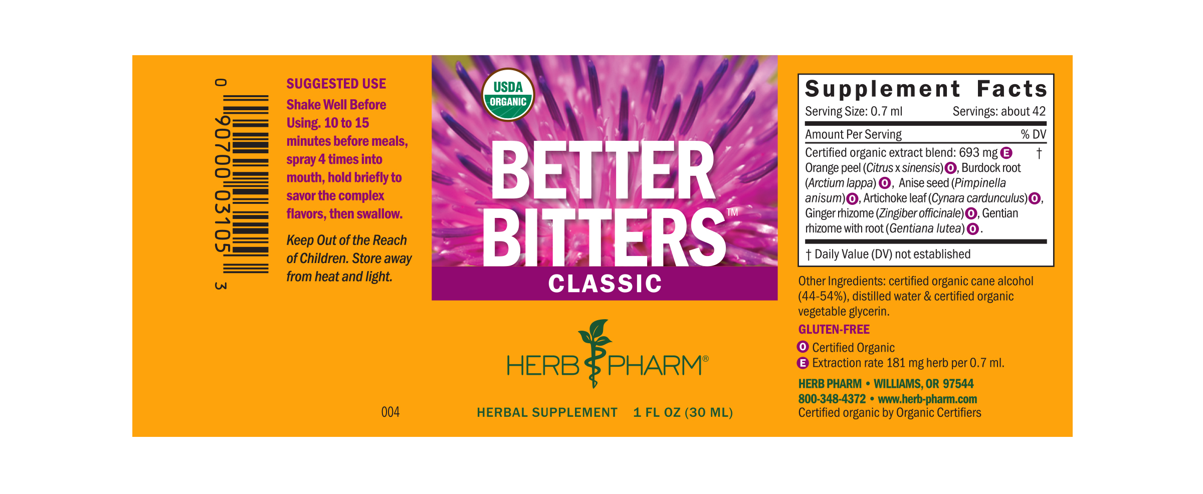 Better Bitters™: Classic harnesses the inherent power of bitter herbs and delivers them in a convenient spray form. It is a very crisp and balanced formula for the bitters purist. It features Gentian rhizome with root, popular in traditional European bitters preparations, collected from Certified Organic Gentiana lutea plants. The herbs in the formula are extracted and preserved with Certified Organic cane alcohol and vegetable glycerin.