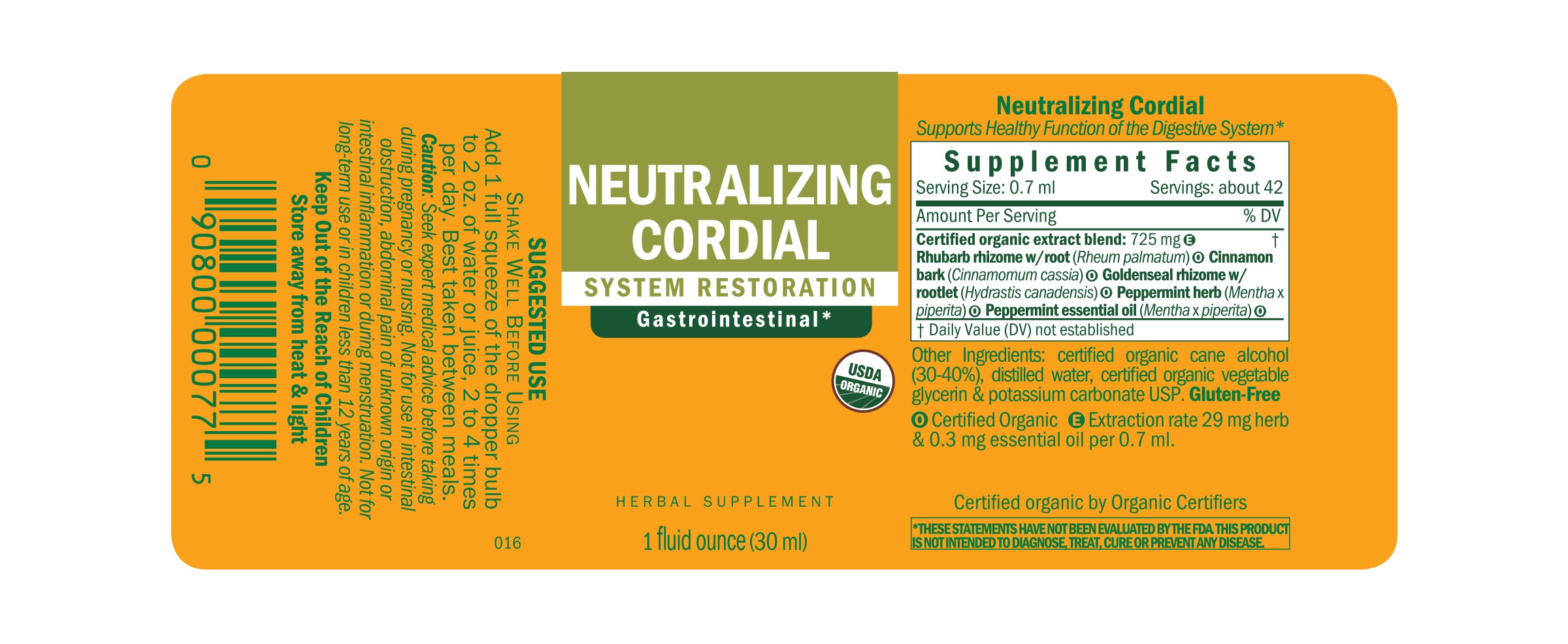 Neutralizing Cordial features Rhubarb extracted from the rhizome with root of Certified Organic Rheum palmatum plants. The plant is commonly called Malaysia Rhubarb or Chinese Rhubarb because it moved west from China via the Turkish trade routes. The formula also features Cinnamon extracted from the bark of Certified Organic Cinnamomum cassia trees.
