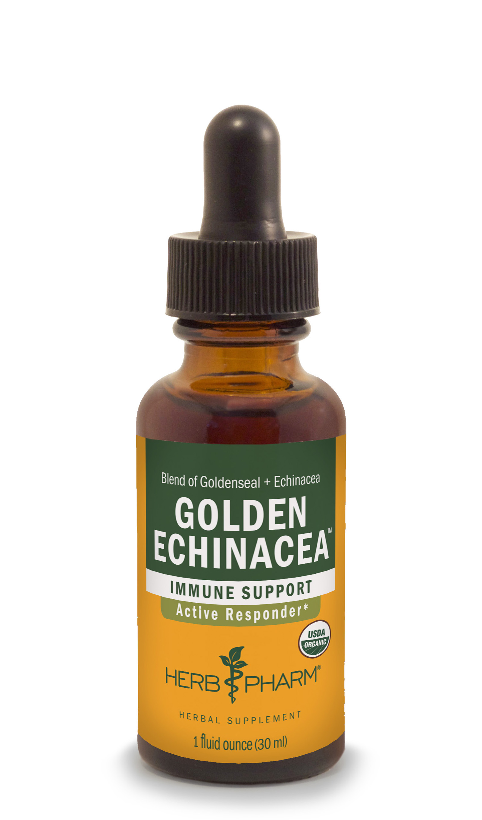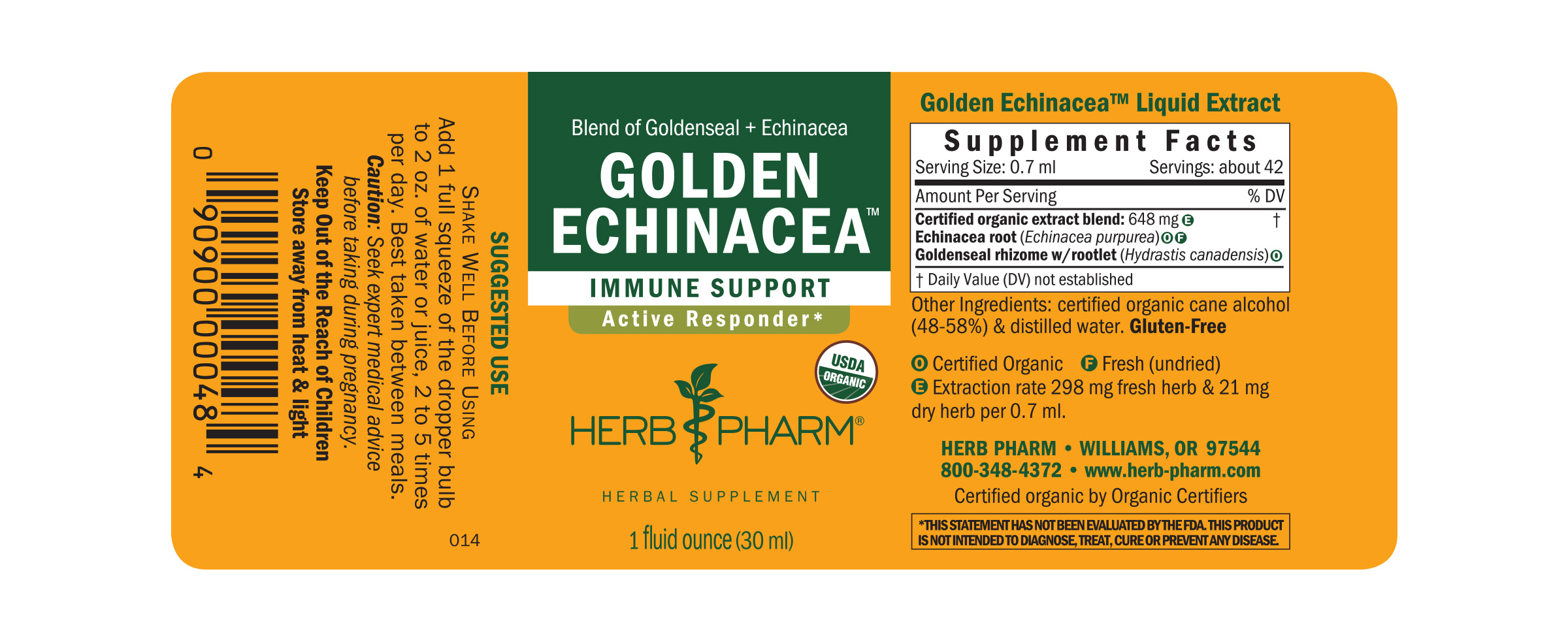 Golden Echinacea features Echinacea prepared from the root of Certified Organic Echinacea purpurea plants. It also includes Goldenseal prepared from the rhizome with rootlet of Certified Organic Hydrastis canadensis plants. We only use cultivated Goldenseal in order to preserve wild-growing populations of this threatened plant.
